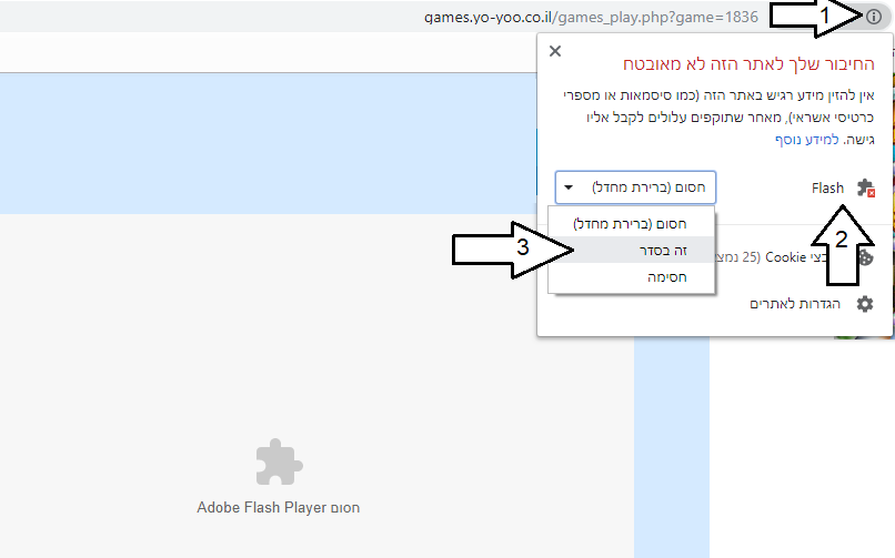 לוחצים על הi הקטן בעיגול למעלה ליד הכתובת של המשחק (חץ 1 ) ואז לוחצים על Flash (חץ 2 ) ואז לוחצים על "זה בסדר" (חץ 3)